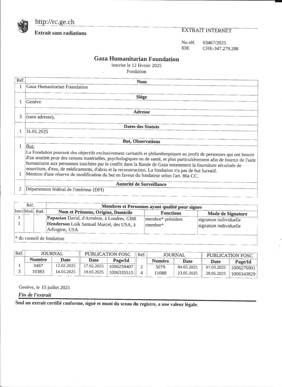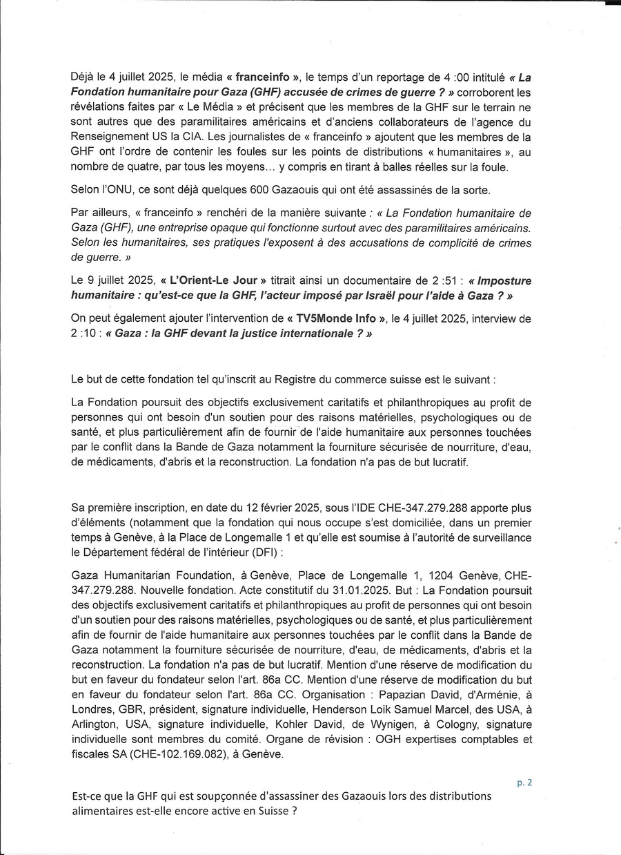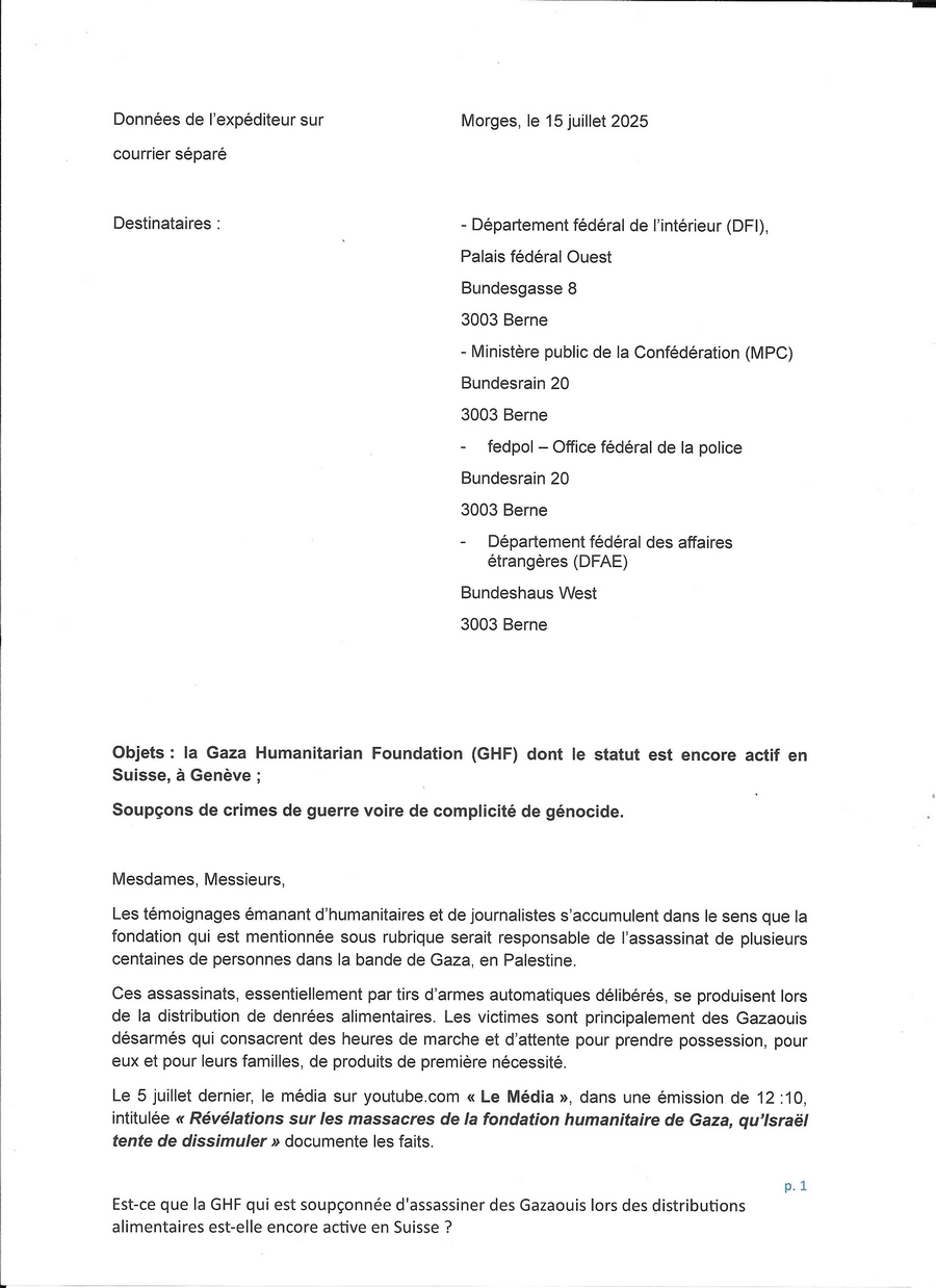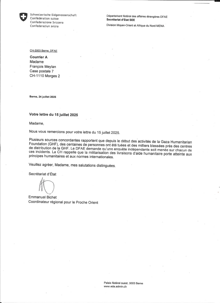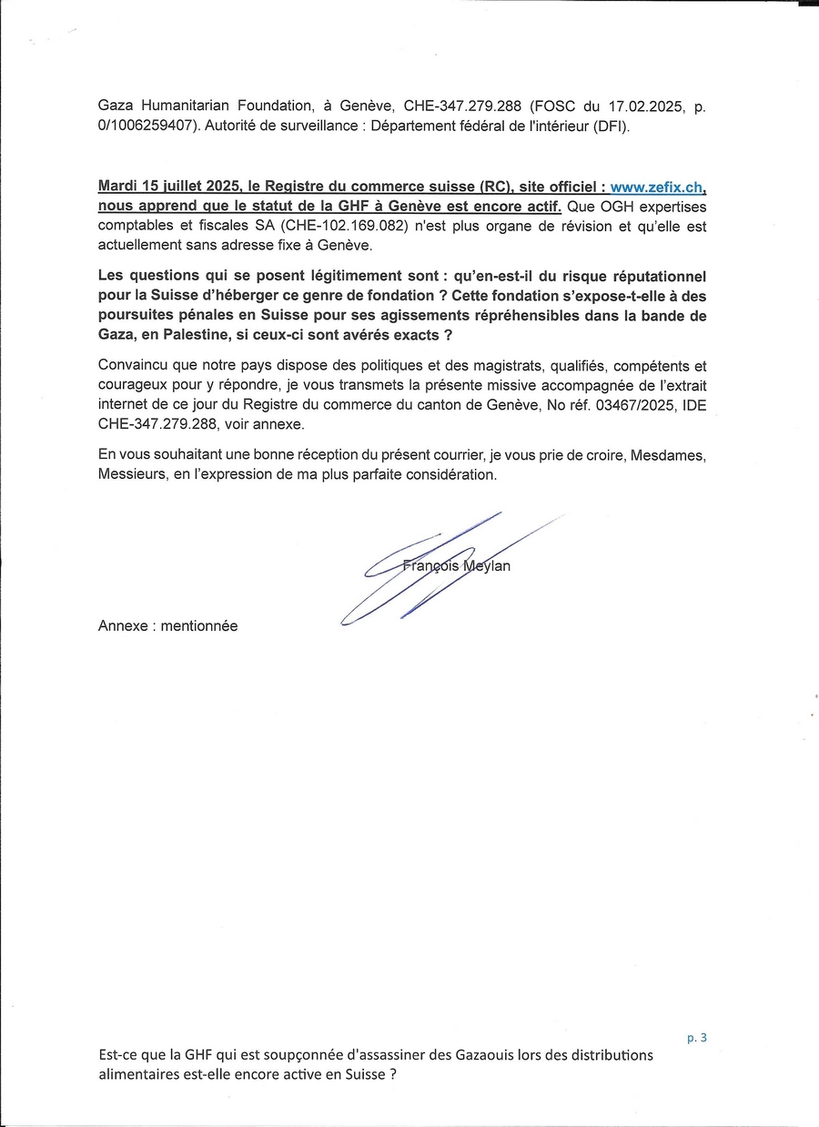 | Voici la démarche effectuée par M. François Meylan, candidat des Indépendants vaudois pour le Conseil des Etats en 2023, auprès de l'administration fédérale au sujet de la fondation Gaza Humanitarian Foundation, active à Gaza et enregistrée en Suisse. |